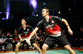 第1ダブルスには今年国際試合でも実績を積み上げてきた井上拓斗・金子祐樹組が登場。エースダブルスを相手に立ち上がりからリード、後半は金子の強力なスマッシュが決まり先取。第2ゲームは井上が前衛で軽快なさばきを見せ、着実にリードを広げて快勝しました。