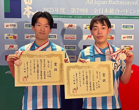 また、男子ダブルス岡村 洋輝・三橋 健也組が準優勝、熊谷 翔・西 大輝組が第3位入賞となりました。