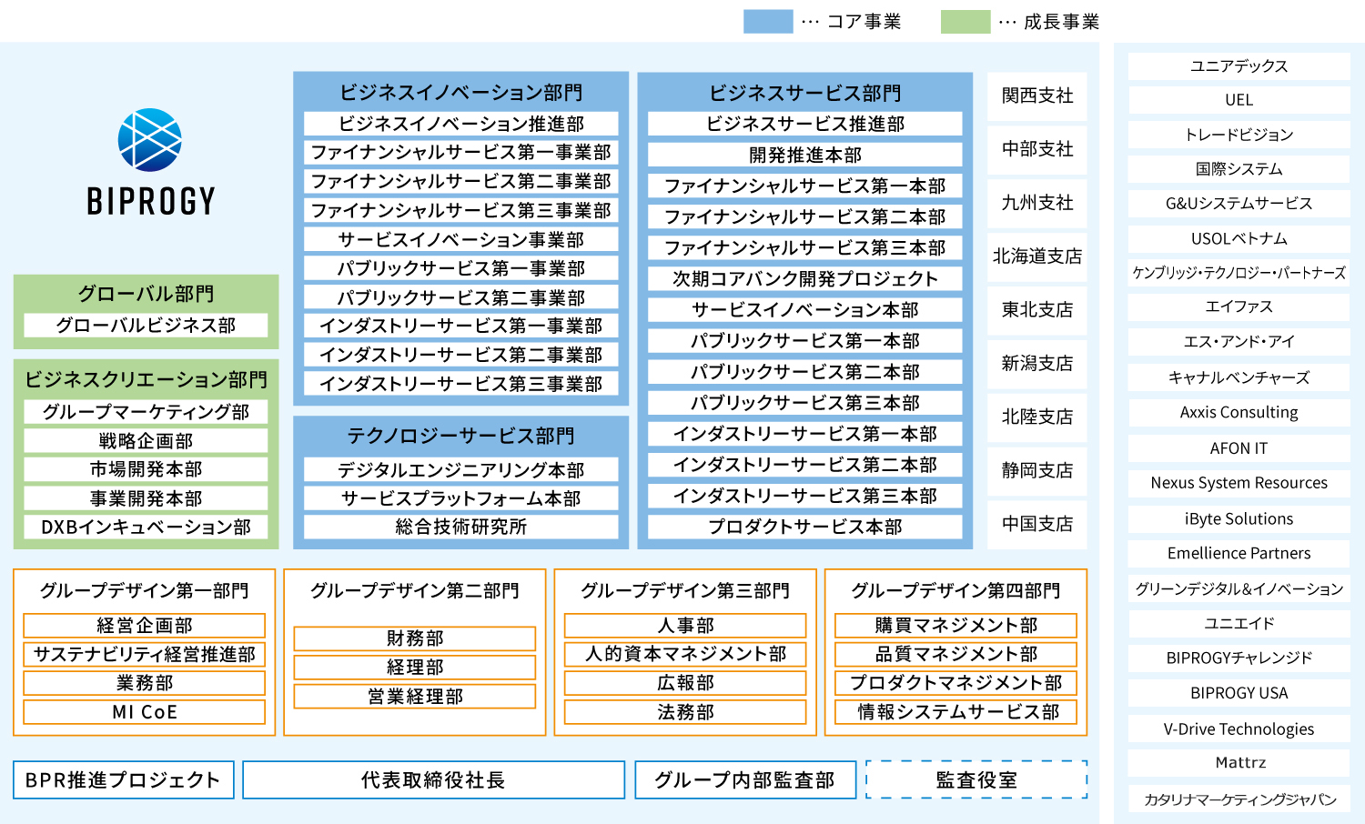 BIPROGY株式会社は、ビジネスイノベーション部門、ビジネスサービス部門、テクノロジーサービス部門のコア事業3部門、グローバル部門、ビジネスクリエーション部門の成長事業2部門、グループデザイン第一部門、グループデザイン第二部門、グループデザイン第三部門、グループデザイン第四部門と9つの支社・支店、22のグループ企業により構成されています。