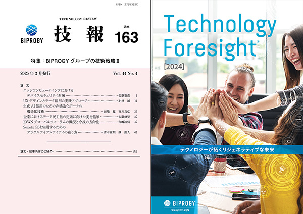 BIPROGYが年4回発行している技術情報誌「技報」の説明と冊子の無料配布を行います。冊子の内容は、生成AIや大規模言語モデルの活用、電力を効率的に使用するためのリソース制御、3次元統合CAD/CAMシステムなどに関するBIPROGYグループの取り組みと技術の紹介です。定期無料送付の申し込みも受け付けます。また、Regenerationをテーマにテクノロジー視点で5年~10年先の未来像を論じる「Technology Foresight」の冊子も配布します。