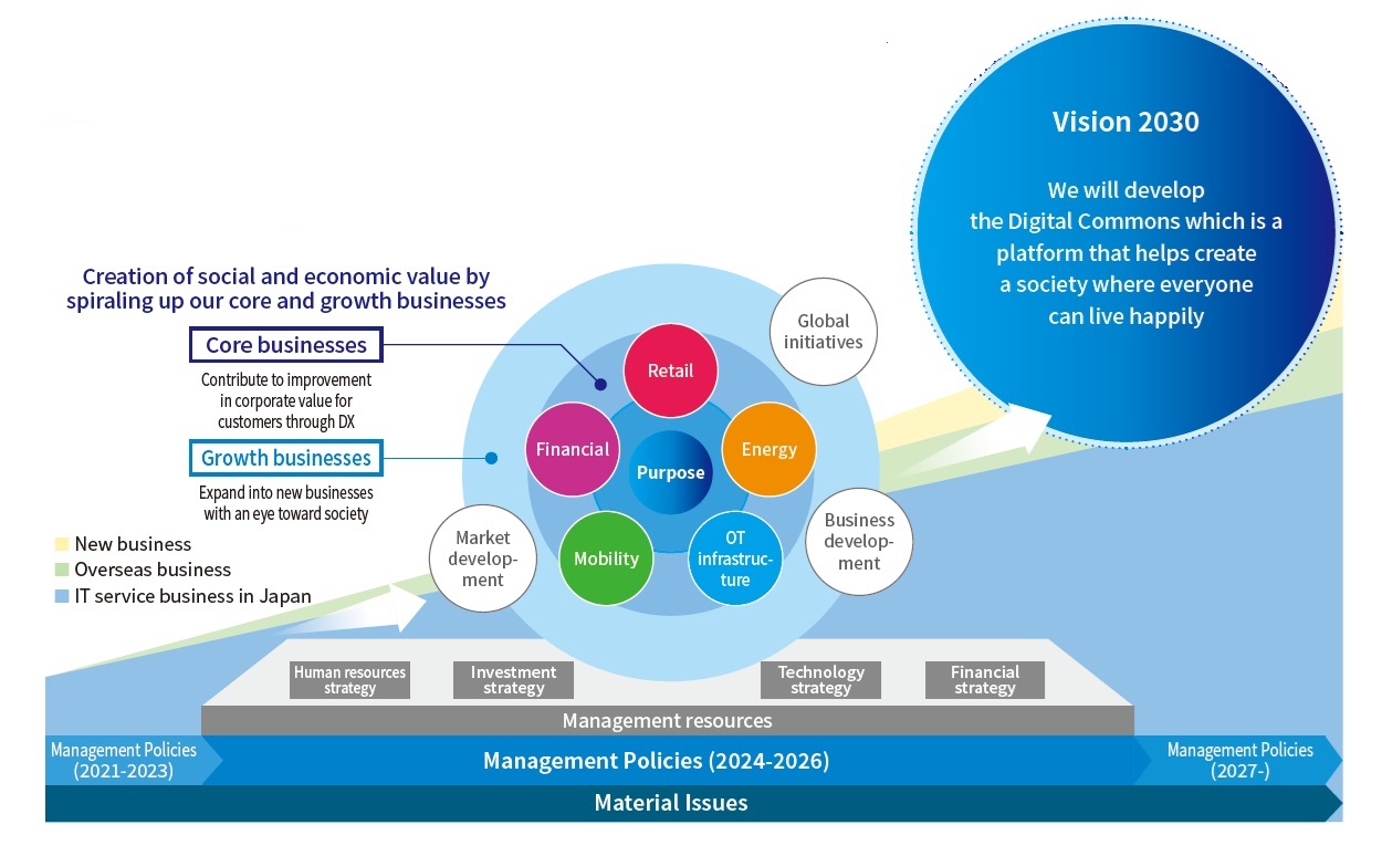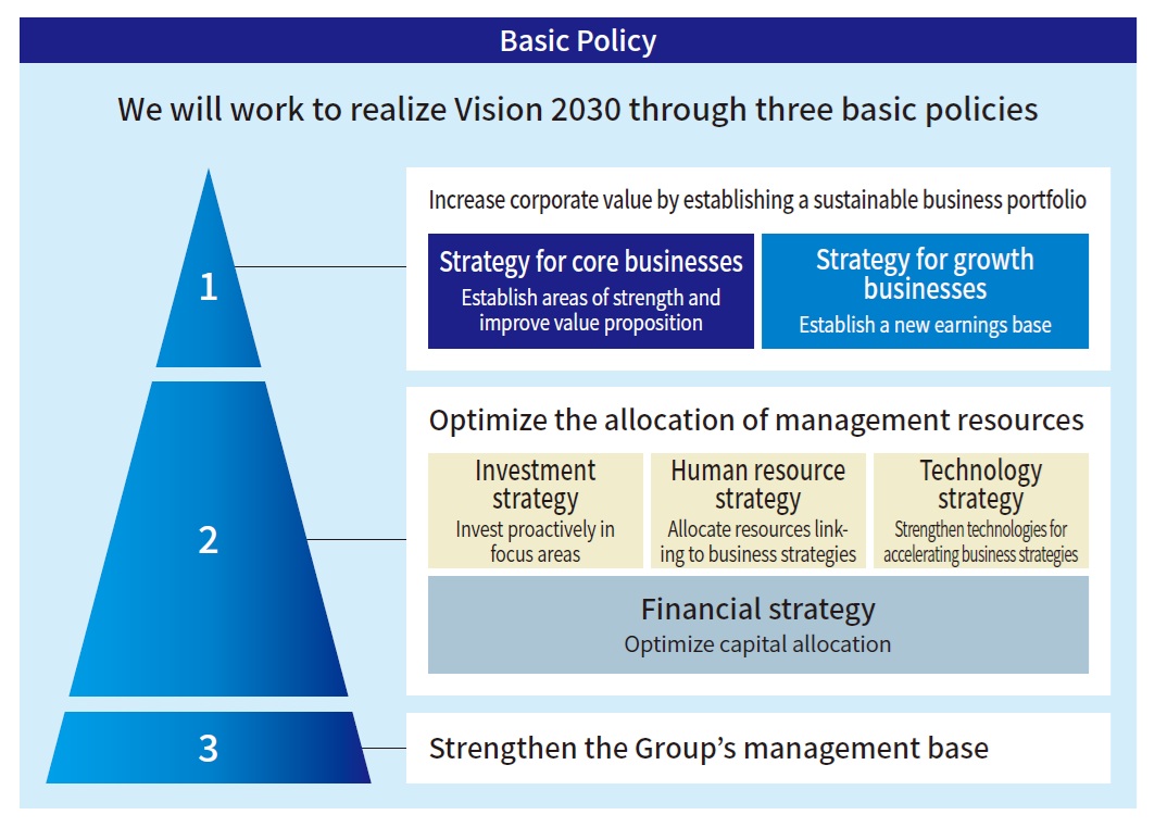 We have set three basic policies to achieve Vision 2030. First, to “increase corporate value by establishing a sustainable business portfolio,” we will focus on two business strategies: a core business strategy and a growth business strategy. In the core businesses, we will concentrate management resources on focus areas, make proactive development investments, and allocate human capital appropriately to improve our value proposition and enhance the value we deliver. At the same time, we will implement productivity-enhancement measures, expand service-oriented businesses, and improve profitability. In the growth businesses, we will capture market share in new service fields and growth markets, accelerate social digital transformation (DX), and expand global operations with a focus on ASEAN. The second policy is to “optimize the allocation of management resources,” under which we will pursue aggressive growth investment, human-capital deployment, and technological enhancements linking to our business strategies. The third is to “strengthen the Group’s management base,” through which we will drive transformation toward a more flexible Group value chain.