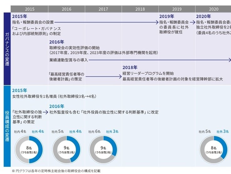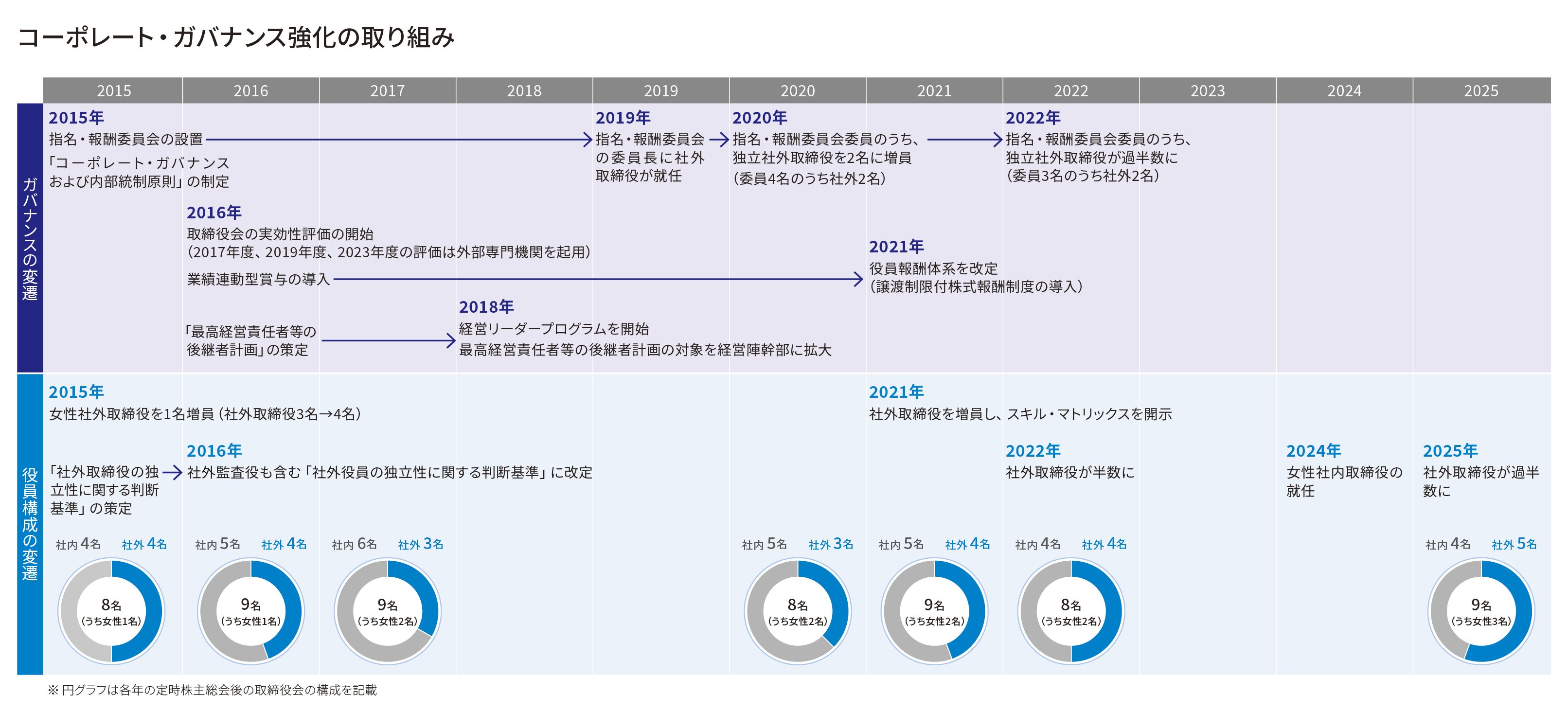 当社グループは、透明・公正かつ迅速・果断な意思決定を行う仕組みとしてのコーポレート・ガバナンス強化のため、常に改善に取り組んでいます。また、ビジネスエコシステムの創出にあたっては、多様なステークホルダーとの信頼関係構築によりビジネス機会を拡大することが重要であるため、取締役・監査役の多様性を確保するとともに、スピード感のある進化に向けた後継者計画も注力すべき重点項目として捉えています。