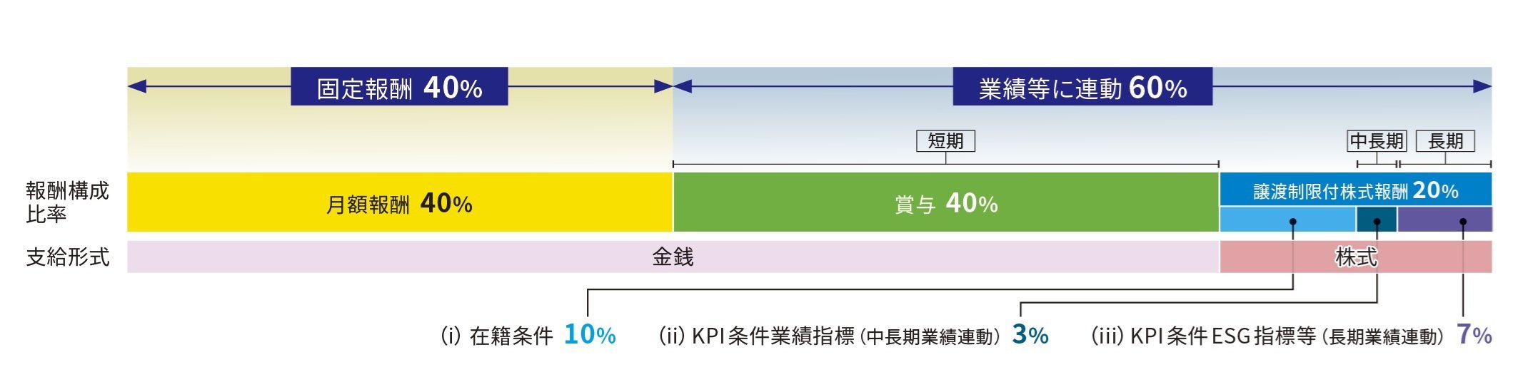 業務執行取締役に対し譲渡制限付株式報酬を採用し、(i)在籍条件、(ii)中長期の業績指標(当社株式に係る株主総利回り(TSR)の対TOPIX成長率)、(iii)ESG指標の3つの条件・指標を取り入れており、それぞれに対し、3:1:2の割合で割り当てられます。