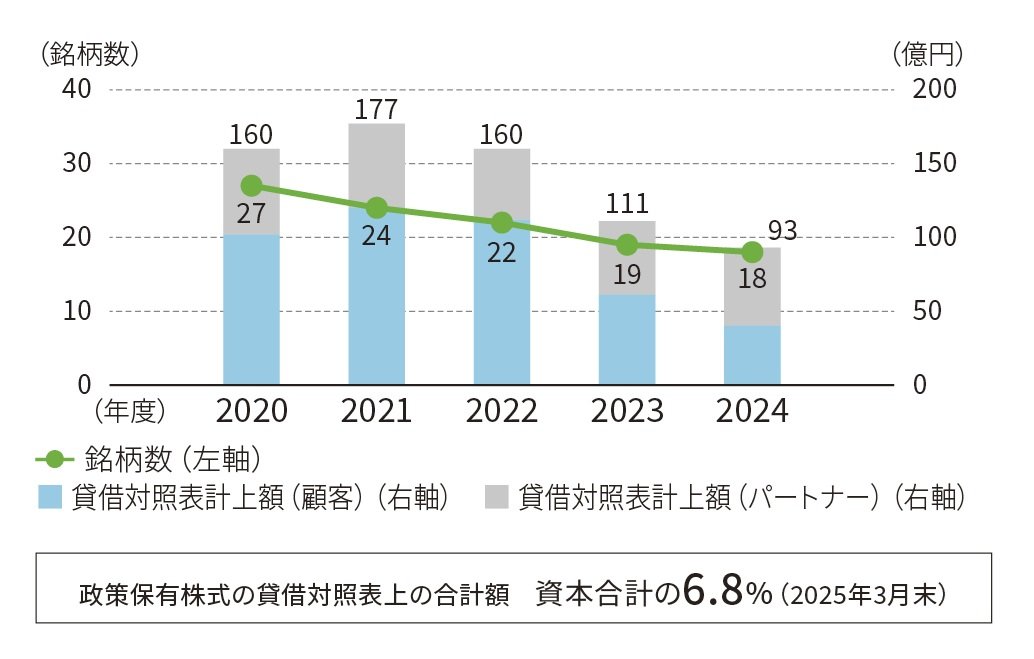 当社は、取引先との関係維持・強化により収益基盤の拡大につながるなど、当社の企業価値向上に資すると認められる場合には、当該取引先の株式を政策的に保有することがあります。株式取得に際しては、社内規程に則り取得の是非を判断し、保有後においては、毎年取締役会で保有の適否の検証を行い、縮減を進めています。その結果、2024年度末の上場株式の保有銘柄数は前年度末比1銘柄減少の18銘柄となりました。また、貸借対照表上の合計額は前年度末比で17億円減少し、政策保有株式の貸借対照表上の合計額は資本合計の6.8%になりました(前年度末:7.6%)。今後も保有意義が薄れた銘柄については売却を進めていきます。 保有する上場株式全銘柄について、個別銘柄ごとに保有目的の持続性および事業戦略との整合性、ならびに関連取引利益などの状況を踏まえ、保有の適否を取締役会で検証しています。