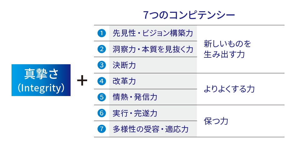 「先見性・ビジョン構築力」とは、当社グループの将来を見通し、高い志を持ってビジョンを掲げ、未来への約束(コミットメント)をする力です。「洞察力・本質を見抜く力」とは、グローバルな視点で世界の潮流や変化を読み解き、日本経済、つまり世の中の動きを洞察し、あらゆるものの価値の本質を見抜く力です。「決断力」とは、予測不可能な状態の中でも、リスクを認識したうえで、揺らぐことなく信念を持って方向性を決める力を指します。