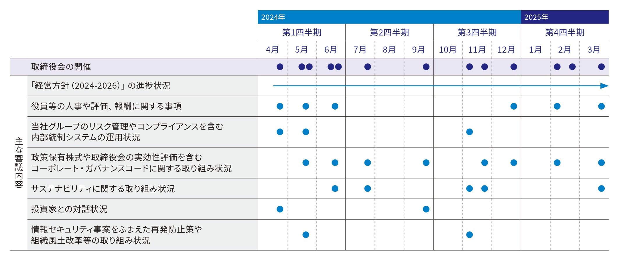 - 現状、取締役会において、活発な議論がなされているが、経営上の重要な課題のうち、後述の「2025年度の対応方針」(1)に記載した項目については、更なる議論の充実が必要である。また、基本的な取締役会の役割・機能は変化させる必要はないものの、スピード感をもって重要なテーマについて議論を尽くすため、議題設定を工夫し、議論の時間を確保する必要がある。