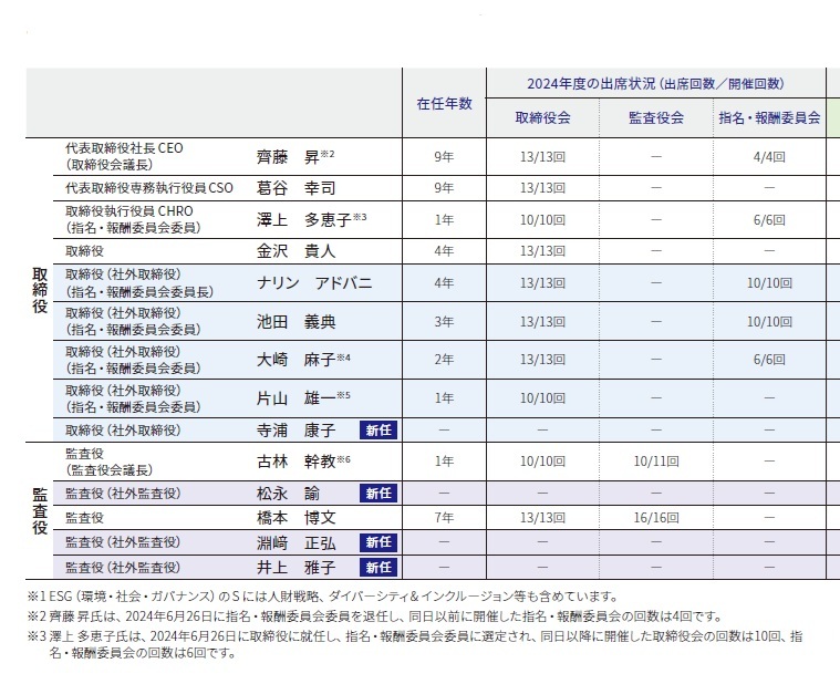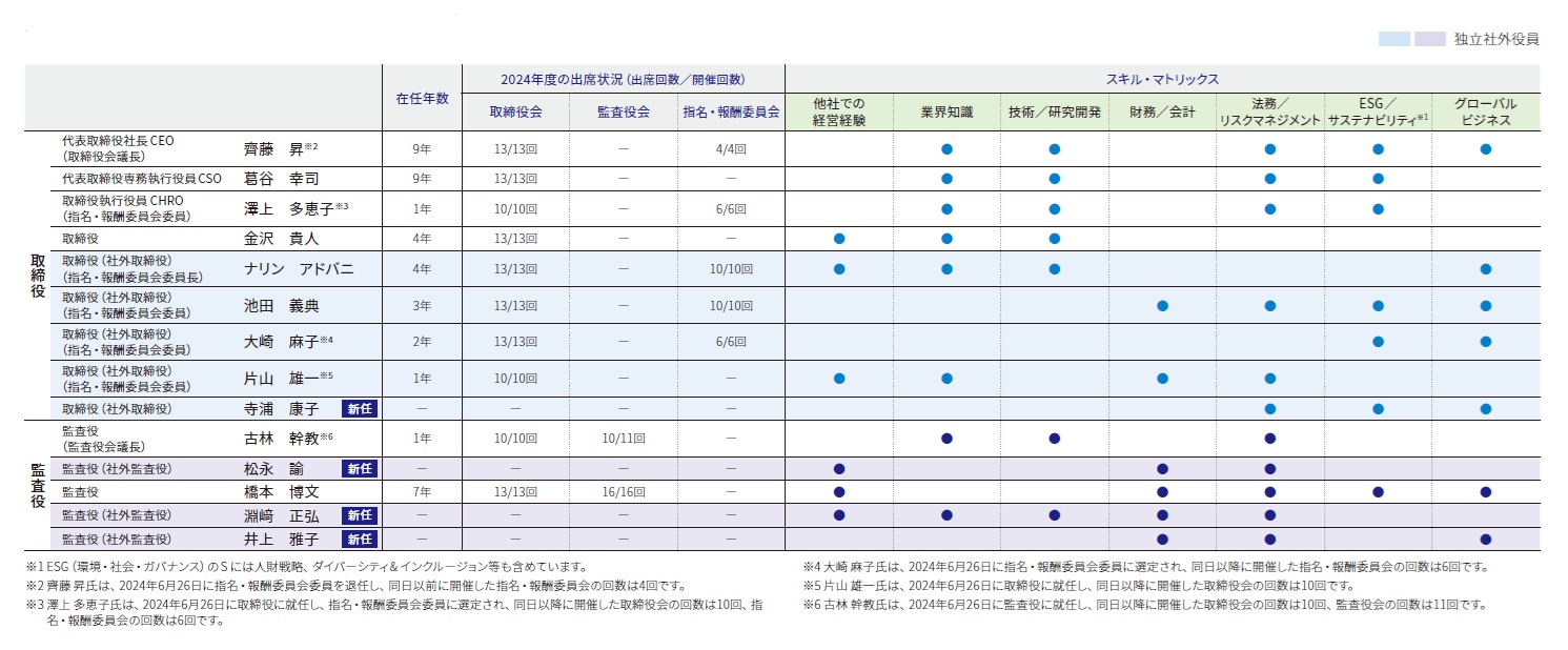 | 他社での経営経験 | 事業環境が急速に変化する中、経営者が「経営方針(2024-2026)」のもと、的確かつ迅速な経営判断を行い、会社を社会的価値創出企業へ変革させていくためには、他社の企業経営経験や実績を持つ社外取締役による的確な助言・監督が有用である。 |