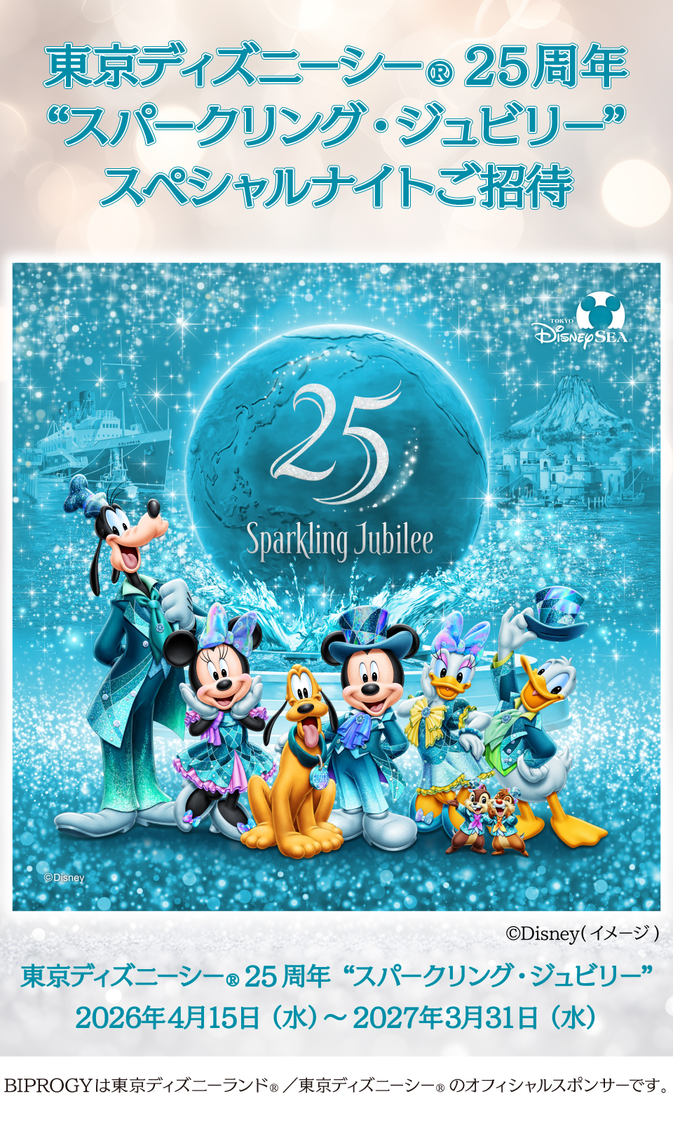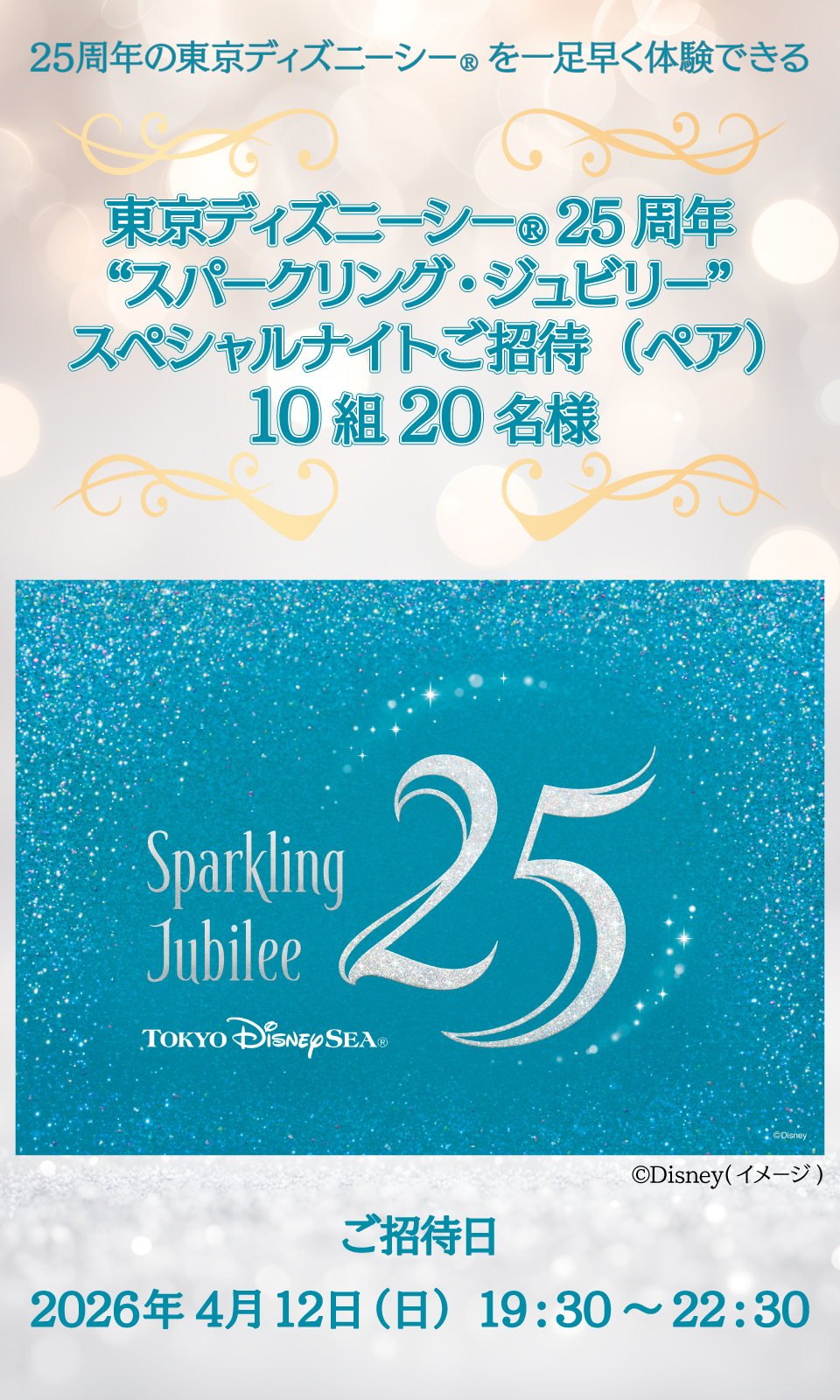 東京ディズニーシー25周年”スパークリング・ジュビリー”スペシャルナイトパスポート(以下、本パスポート)は、東京ディズニーシーに指定日時(2026年4月12日(日)19:30-22:30)の間に使用いただけるパスポートです。なお、本パスポートは当キャンペーン当選者以外の方も利用されます。