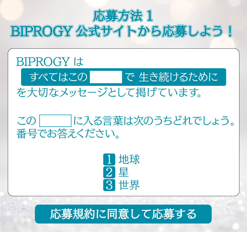 応募規約をご確認いただいたうえで、「応募規約に同意して応募する」ボタンから、応募専用ページでクイズの答えと必要事項をご入力いただきご応募ください。