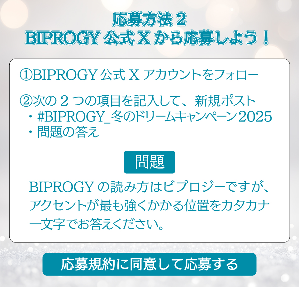 応募規約をご確認いただいたうえで、BIPROGY公式Xアカウントをフォローし、「#BIPROGY_冬のドリームキャンペーン2025」のハッシュタグと問題の答えを、新規ポストで記入してご応募ください。